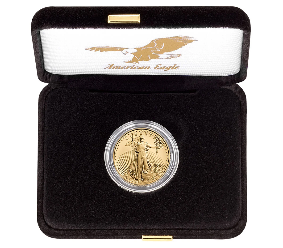 To complement these stunning designs, each 22-karat coin is encapsulated and then placed in a stylish clamshell and classic black presentation case with the United States Mint seal on the lid. The case fits into an outer sleeve with a beautiful gold foil image of Liberty. Each coin includes a certificate of authenticity with matching imagery.